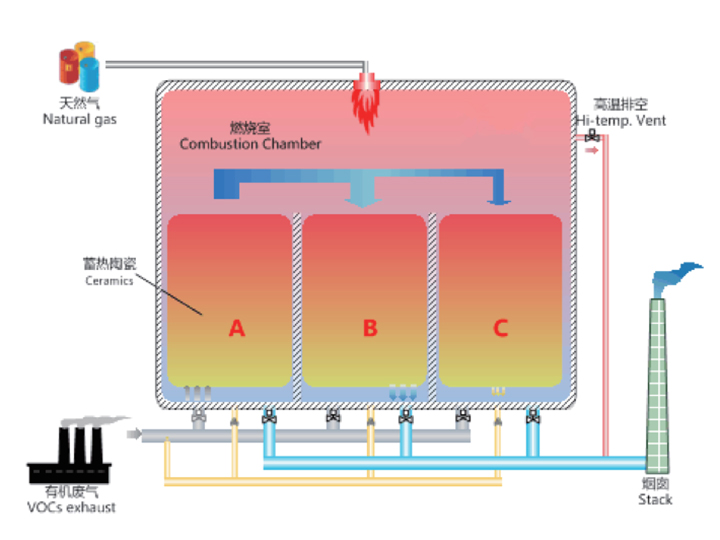 The exhaust gas is heated to around 300 ℃ through thermal storage ceramic heat exchange at around 70 ℃, and undergoes flameless combustion reaction at a temperature of around 350 ℃. After combustion, the exhaust gas is cooled to around 110 ℃ through another thermal storage chamber and thermal storage ceramic heat exchange. Organic exhaust gas undergoes oxidation reaction in the combustion chamber, generating CO2 and H2O, which are purified and discharged into the chimney.